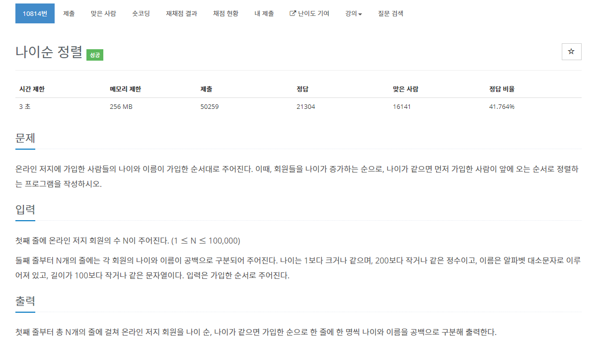 - 나이 순/가입한 순 모두 String 이므로 parseInt 를 통해서 정렬 비교 함수 완성.. String.compareTo 로 하면 안된다.